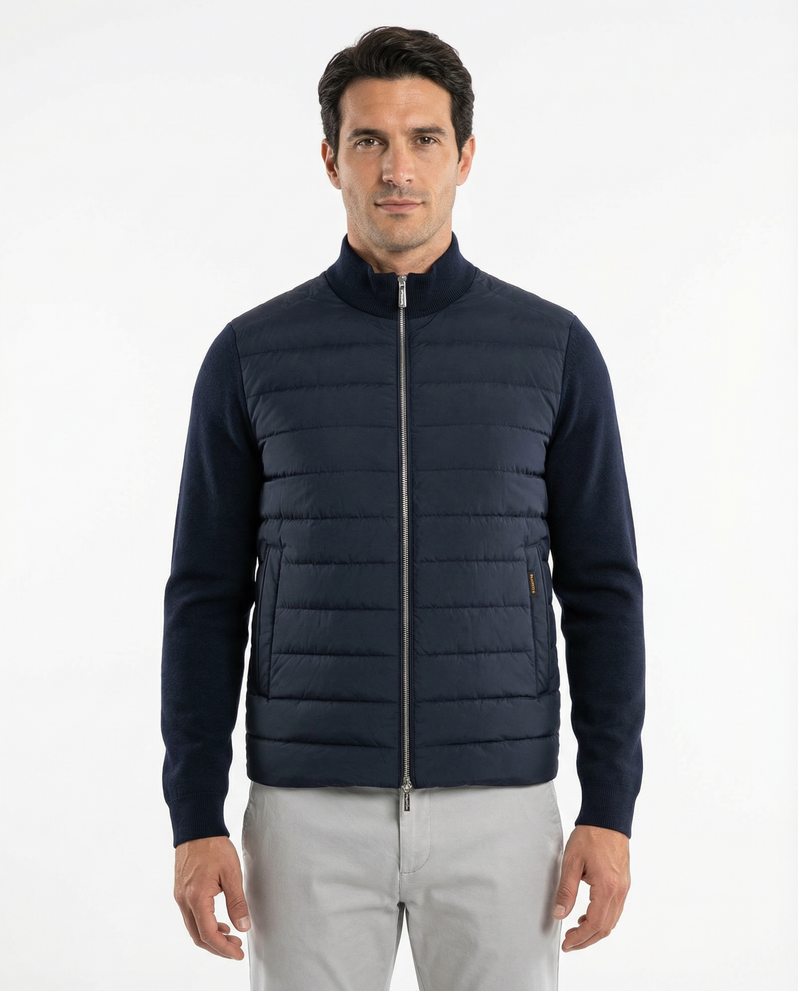 The Moorer Duncan Padded Hybrid Jacket in Navy combines luxurious materials with functional design. Made in Italy, this jacket features a midnight blue exterior crafted from a premium blend of wool, silk, cashmere, and polyamide, offering warmth and comfort. The front zip fastening and long sleeves provide versatility, while the two-side zip-fastening pockets add practicality.